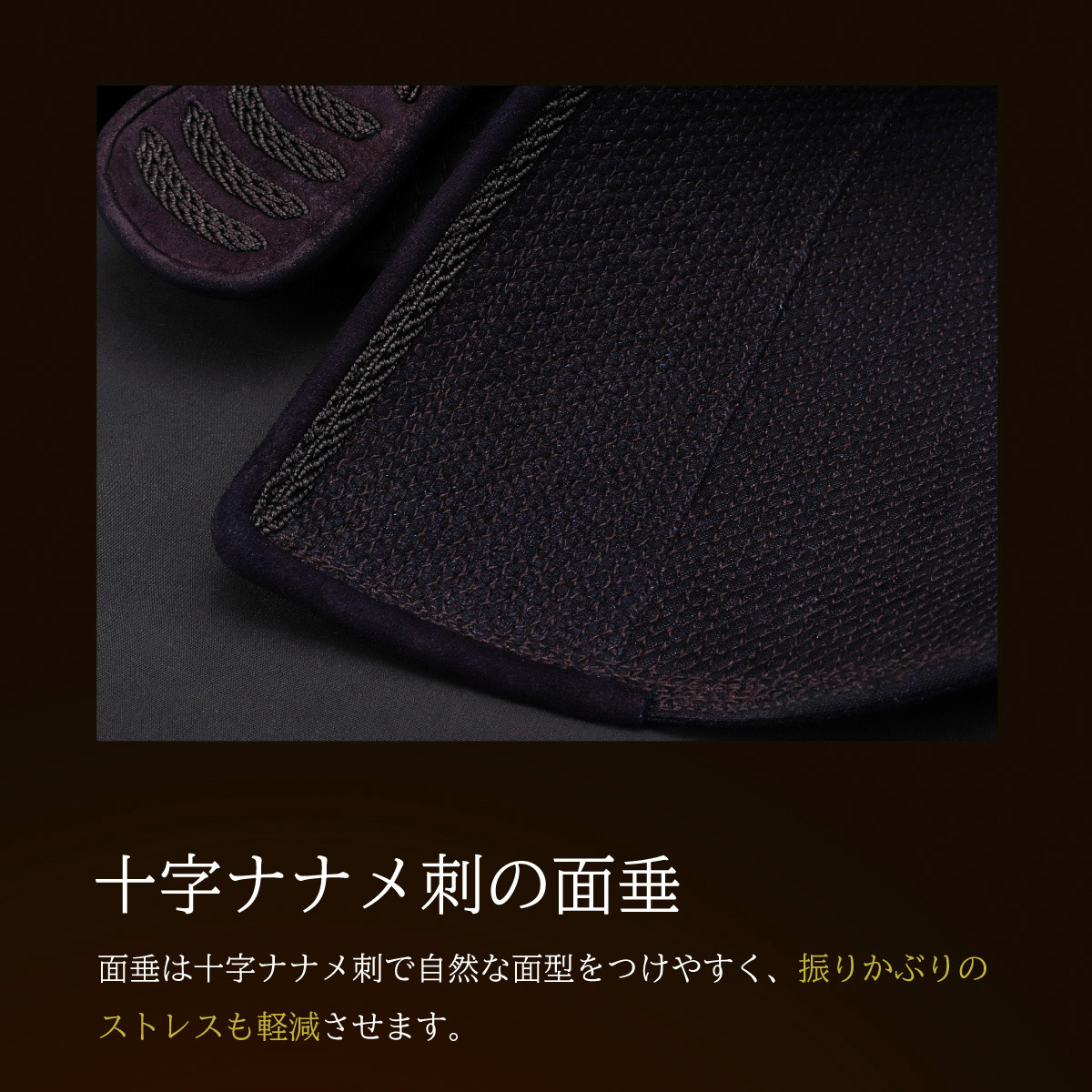しっかりと型がつく十字ナナメ刺の大垂は、昇段審査にも対応できる端正な見栄えを追求。伝統的な美意識と最新の機能性が融合した、試合・審査・稽古のすべてに最適な垂です。