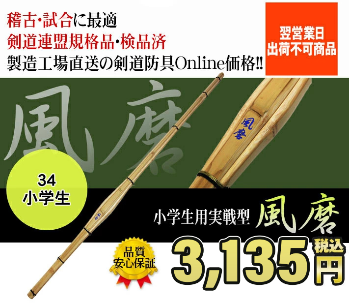 竹刀 剣道 実戦型 竹のみ 34「風磨(ふうま)」小学生 【SSPシール貼付】