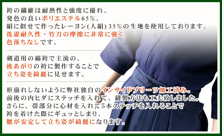 剣道袴は形崩れしないように弊社独自のインサイドプリーツ加工済み。