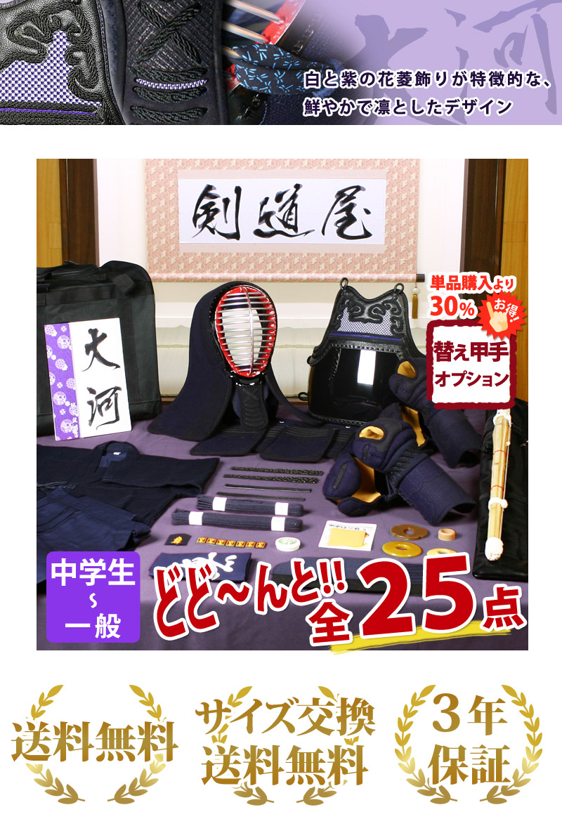 【新入生応援】実戦型 剣道フルセット全25点『大河』 [5ミリ刺し試合向け 防具一式・剣道着・竹刀・バッグ] ●名彫シール ●3年保証書・説明書