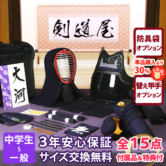 【新入生応援】実戦型 防具一式 全15点『大河』5ミリ刺し PRO ★面手拭が選べる ★洗える小手 ★サイズ交換送料無料対応 ●3年保証書・説明書