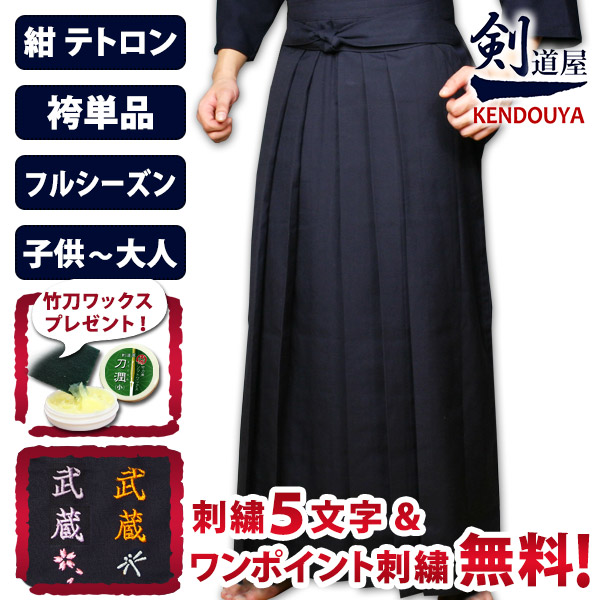 [剣道屋] 紺色 新特製 テトロン剣道袴 【5文字無料+ワンポイント刺繍無料】 内ヒダ縫製加工 子供〜大人用 ★竹刀ワックス付 ●テトロン袴・紺