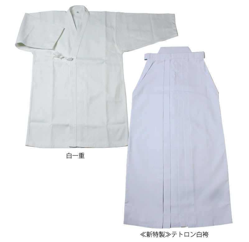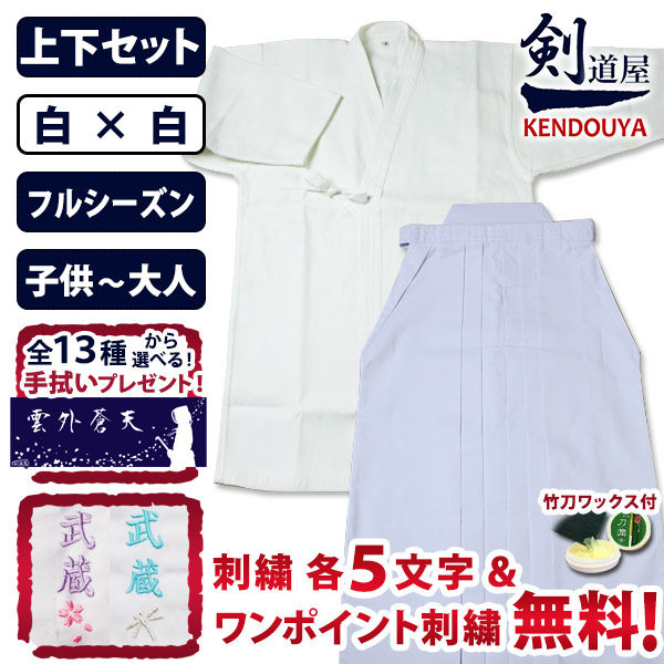 [剣道屋] 白色 上下セット ●「白一重剣道着+新特製テトロン剣道袴・白」 セット ★各5文字無料+ワンポイント刺繍無料 ★オリジナル面手拭付