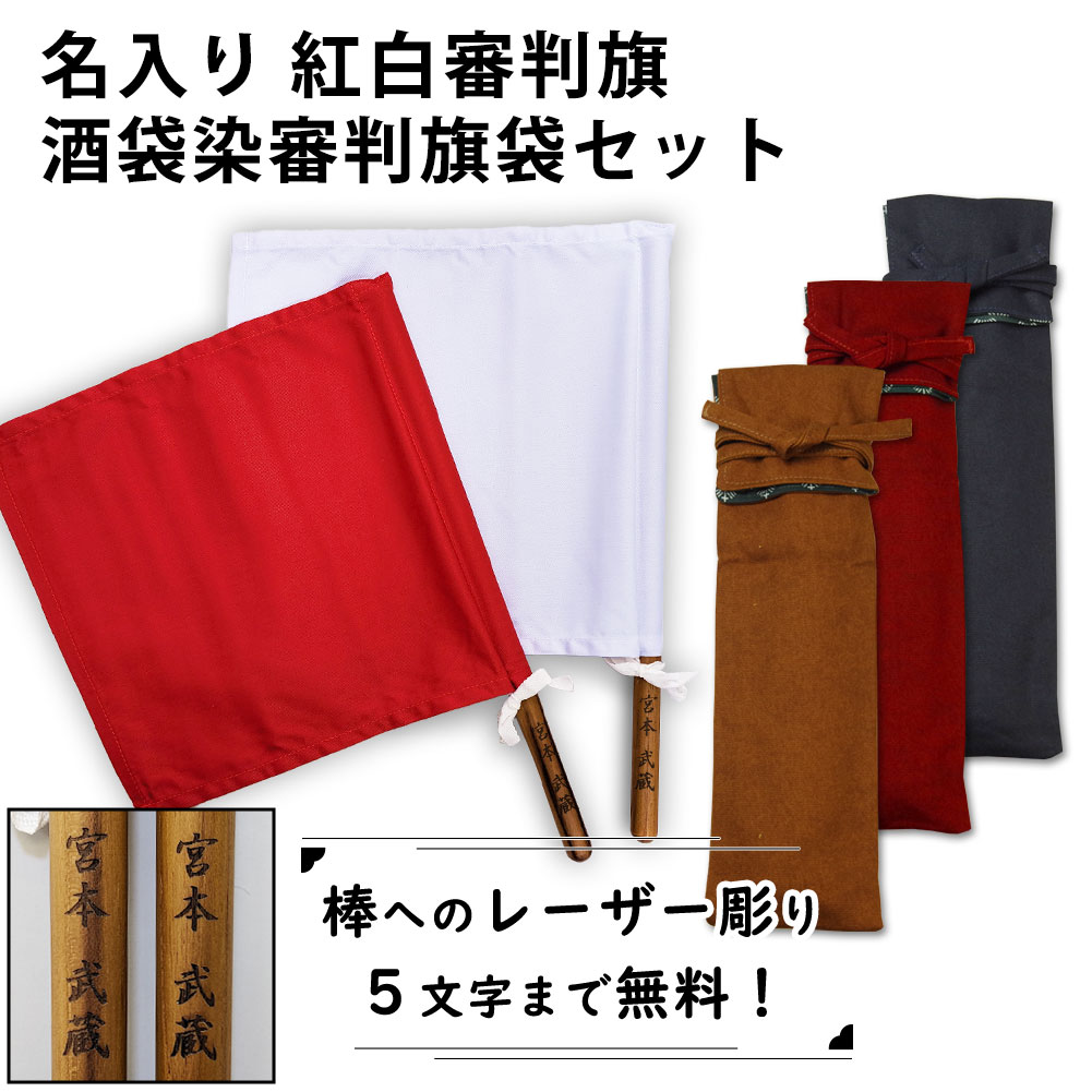 【加工所取寄せ品】 剣道 試合 審判旗 紅白(赤白) セット ●棒レーザー彫り 審判旗(紅白2本1組) チーク材&8号帆布審判旗袋