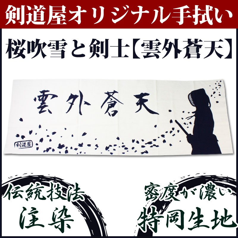 [3000円以上で送料無料] 剣道屋 オリジナル 面手拭い (手ぬぐい・面タオル) 注染 ●桜吹雪と剣士【雲外蒼天】●白色