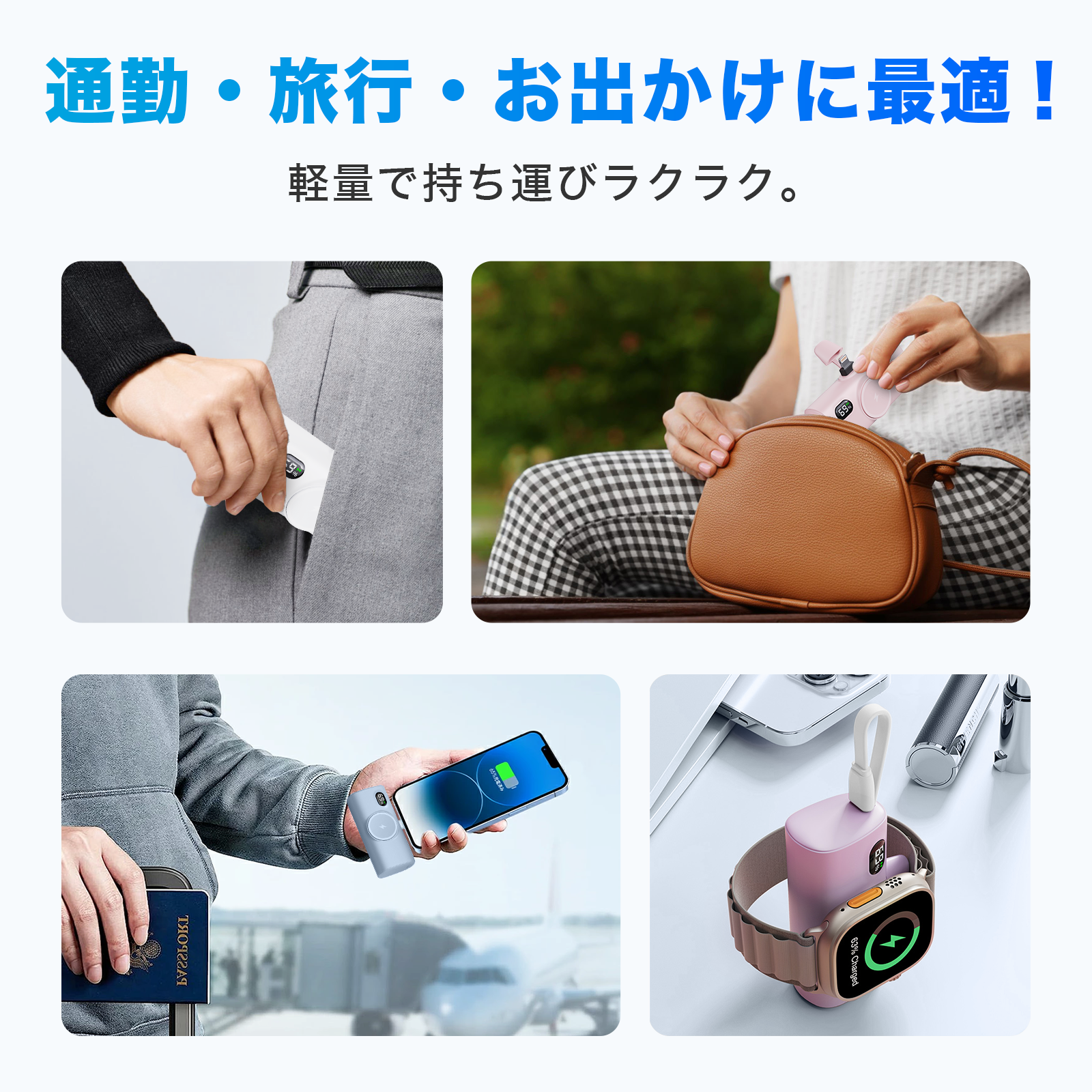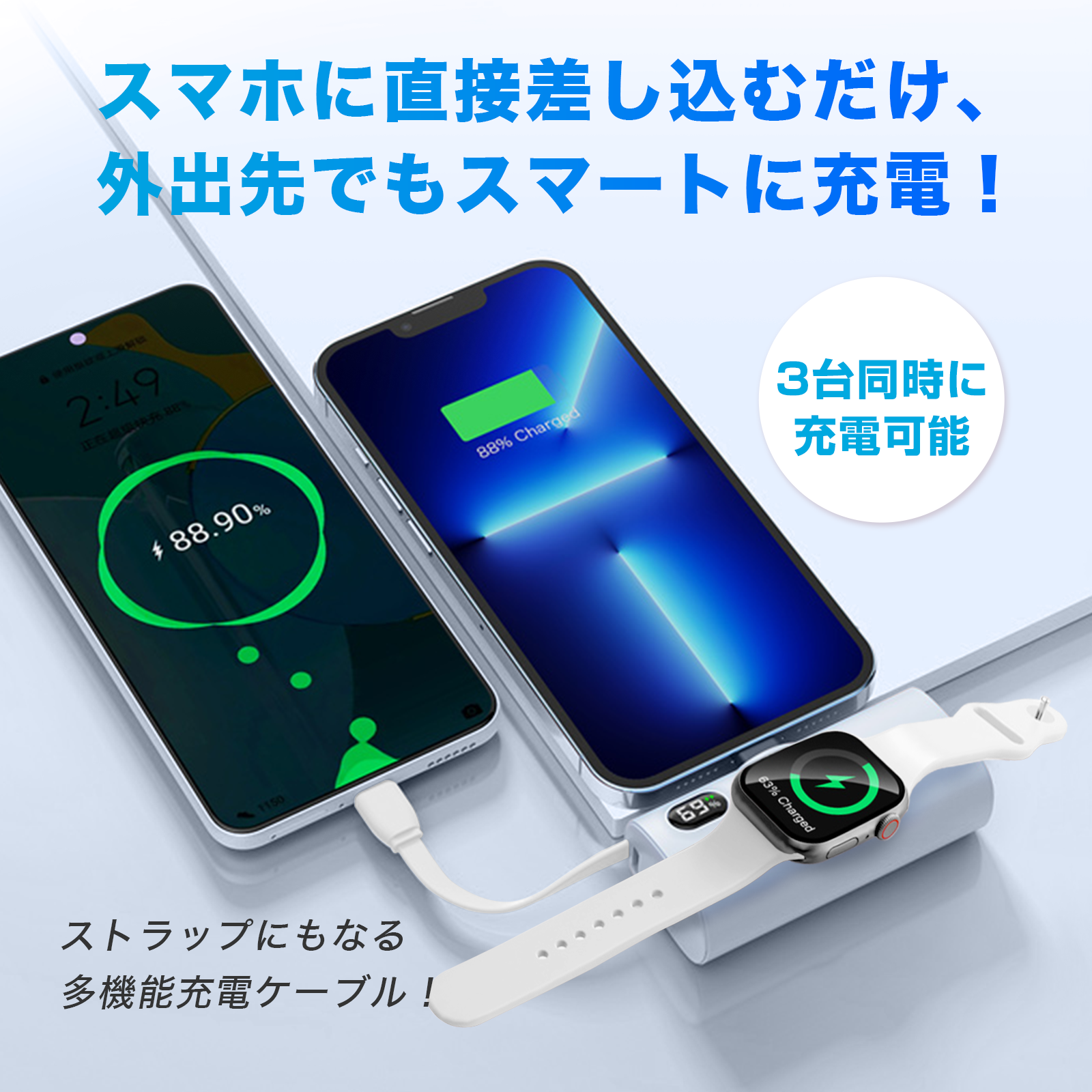 【多機能充電】スマホに直接挿しで充電、内臓ケーブル付で同時充電可能。Apple Watchも磁力でピタッと充電。