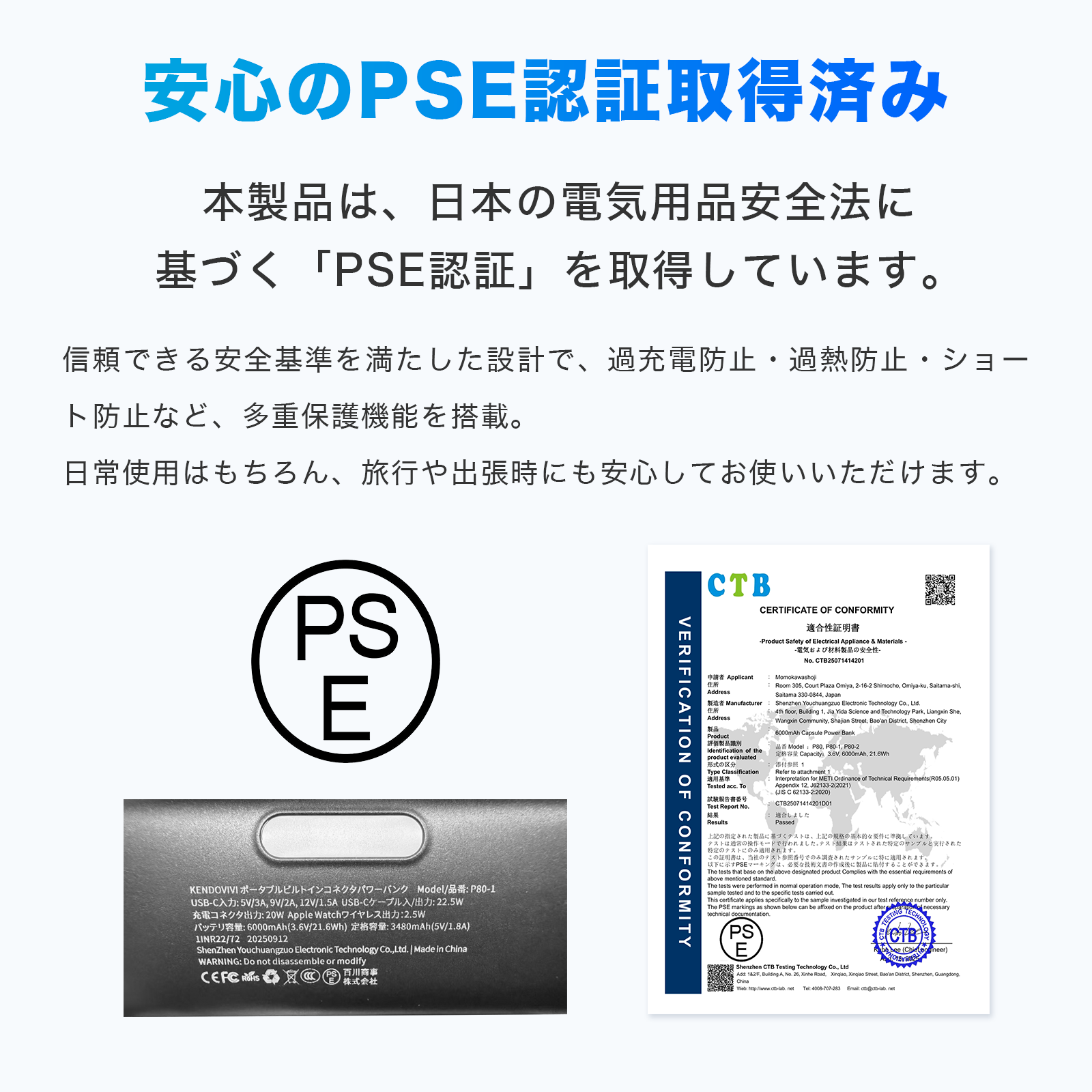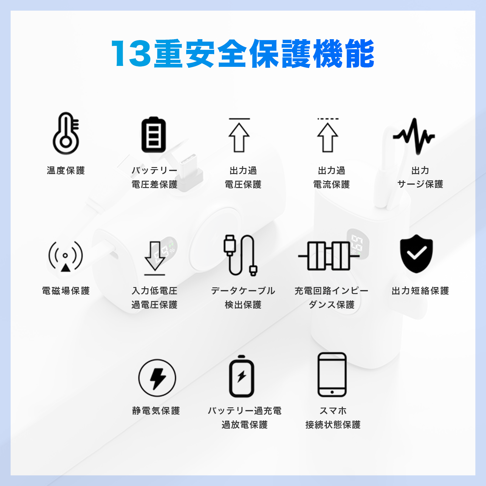 【裏ライト搭載】裏にはライトを搭載仕様となり、防災時にも使えるので安心。【高品質バッテリーセル搭載】過充電・過熱・ショート防止の安全設計で、長期間安心してお使いいただけます。