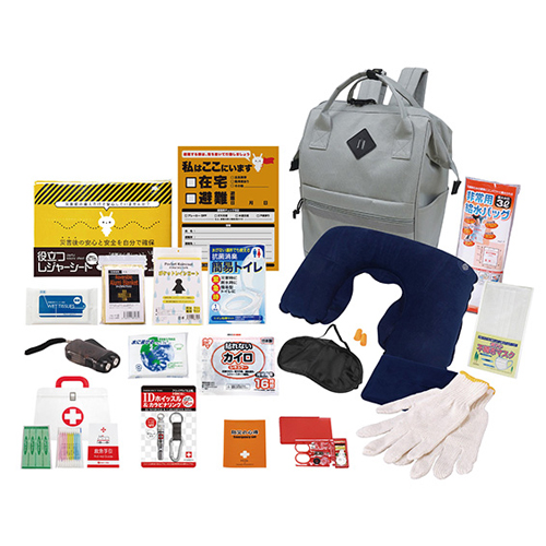 収納リュック・防災の心得・カイロ・レインコート・抗菌消臭簡易トイレ・ダイナモLEDライト・軍手・アルミブランケット・マスク・ネックピロー・アイマスク・耳栓・レジャーシート・給水袋3L・ソーイングセット・緊急避難カード・除菌アルコールウェットティッシュ・水に流せるペーパー・救急4点セット・IDホイッスル&カラビナリング