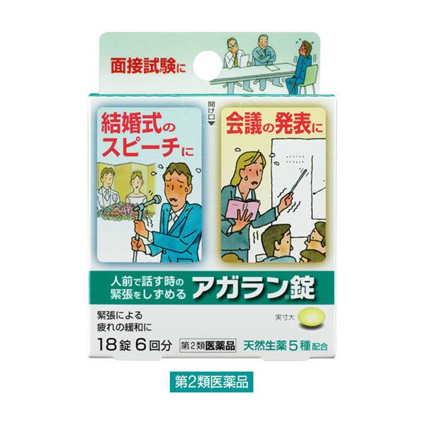 「アガラン錠 18錠」は、神経の緊張をしずめるカノコ草エキスなどの天然生薬5種類を配合した人前で話す時の緊張をしずめる生薬製剤です。言葉が出ない結婚式のスピーチ・大きな会議の発表などでの緊張感をしずめます。面接試験・初めてのデート・ピアノの発表会などでのドキドキする緊張感をゆるめます。有効成分として天然生薬5種類だけを配合しています。緊張からくる疲れをやわらげます。携帯しやすい1回分3錠入アルミ袋包装