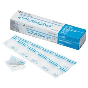 「インジェクションパッド No.36」は、吸収性に優れたセルロース系積層不織布をパッドに用い、しなやかで通気性に富むパルプ・ポリエステル主体の不織布をベースに、皮膚への刺激の少ないアクリル系粘着剤を塗布した、止血用パッド付絆創膏(創面保護材)です。