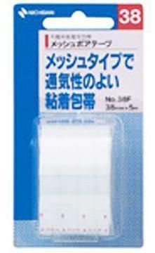 「メッシュポアテープ NO.38F」は、メッシュ状不織布に低刺激の粘着剤を塗布した包帯です。シップ固定などにおすすめです。