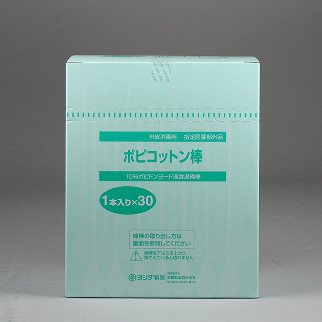 「ポピコットン棒」は、ポビドンヨード液含浸綿棒です。