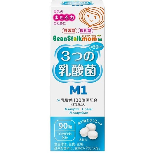 「ビーンスタークマム 3つの乳酸菌M1」は、一日3粒で3種の乳酸菌を合計100億個摂取できるサプリメントです。母乳育児を頑張るママに。