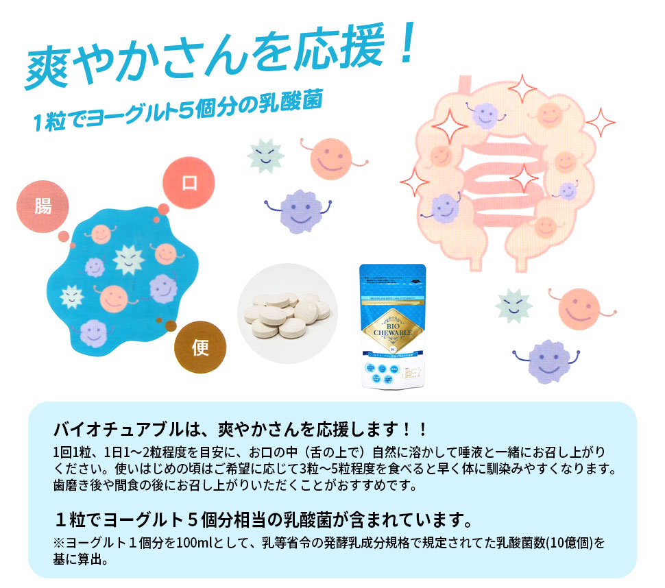 | お召し上がり方 | 通常は1日に1回1粒を1〜2回程度を目安に、舌の上にのせて唾液で自然に溶かしながらお召し上がりください。 使いはじめの頃はご希望に応じて3粒から5粒程度を食べると早く体に馴染みやすくなります。 |