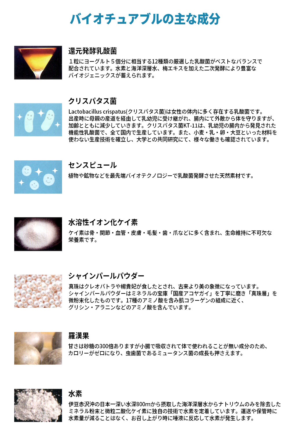 | 成分 | デキストリン(国内製造)、難消化性デキストリン、乳酸菌発酵エキス(黒糖培地・乳酸菌)、ガラクトオリゴ糖液糖、梅エキス、米胚芽、大豆発酵抽出物、ユッカ抽出物、海洋深層水、キラヤ抽出物、KT-11乳酸菌(殺菌)、アカシア食物繊維、水溶性ケイ素、真珠層粉末/ソルビトール、クエン酸、炭酸水素ナトリウム、ステアリン酸カルシウム、二酸化ケイ素、甘味料(ラカンカ)、硫酸マグネシウム、水素 |