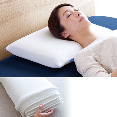 中材(ロール材・コア材)は体圧分散性に優れた立体メッシュ構造。通気性にも優れているので、頭に熱がこもらず一年中快適です。