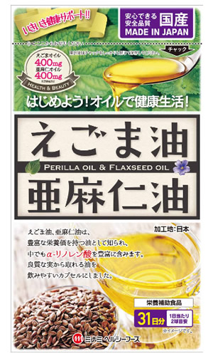 | 原材料 | エゴマ油、亜麻仁油、ゼラチン、グリセリン、酸化防止剤(V.E、V.C) |
