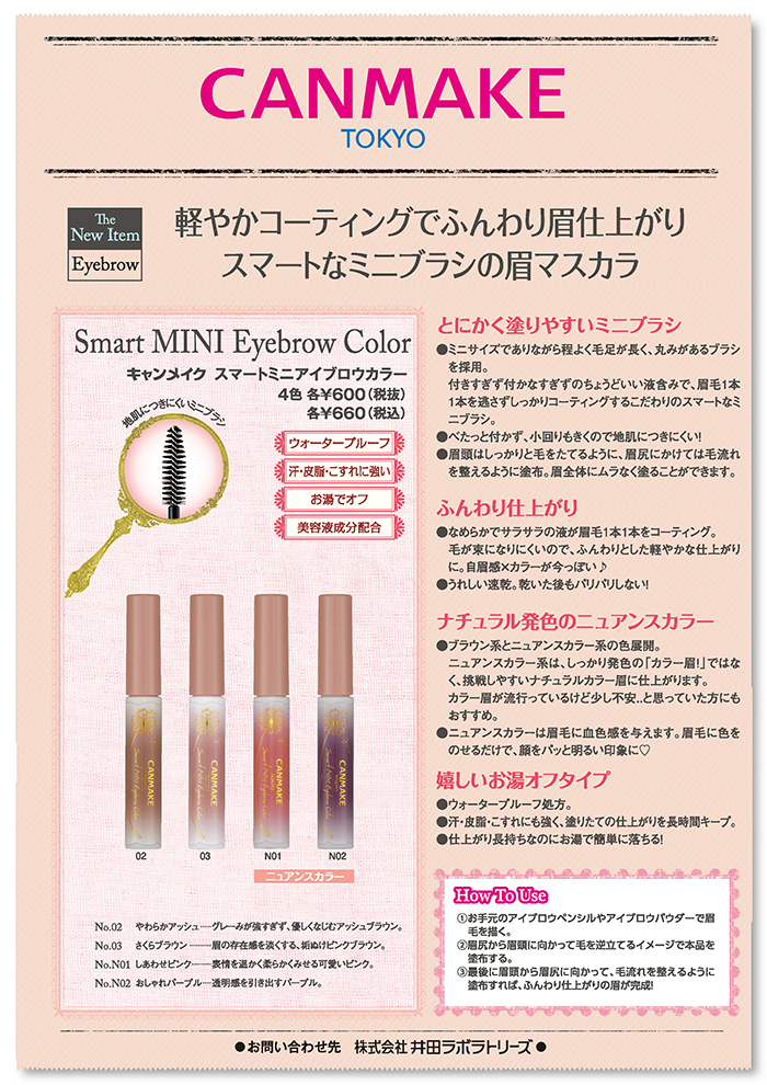 | 使い方 | (1)お手元のアイブロウペンシルやアイブロウパウダーで眉毛を描く。 (2)眉尻から眉頭に向かって毛を逆立てるイメージで本品を塗布する。 (3)最後に眉頭から眉尻に向かって、毛流れを整えるように塗布すれば、ふんわり仕上がりの眉が完成! |