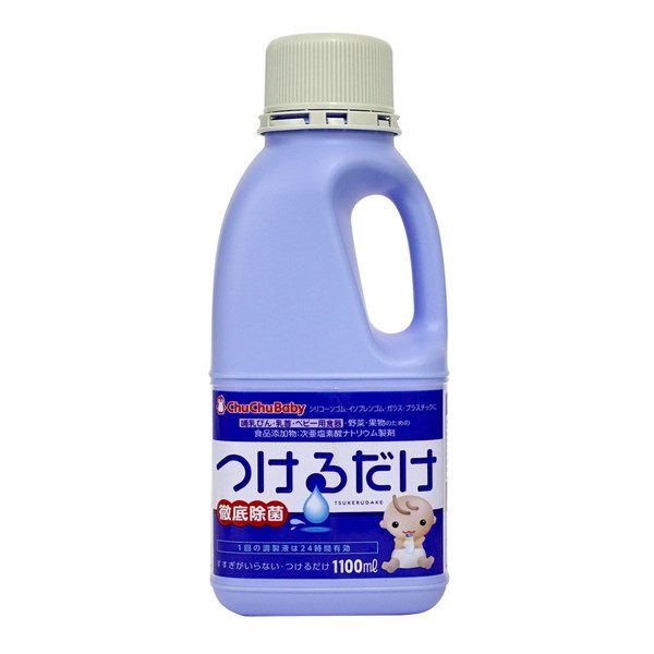 「チュチュベビー つけるだけ 1100ml」は、ベビー食器や介護用食器をつけるだけの哺乳瓶洗浄です。次亜塩素酸ナトリウムを配合しました。ドボッと出ない中栓付き。