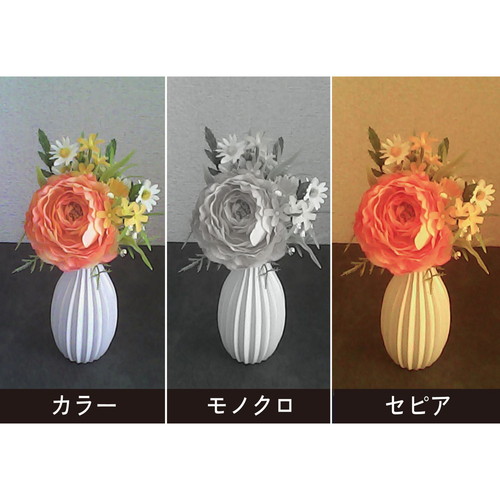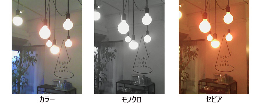 写真はカラー、モノクロ、セピアモードで撮れます。