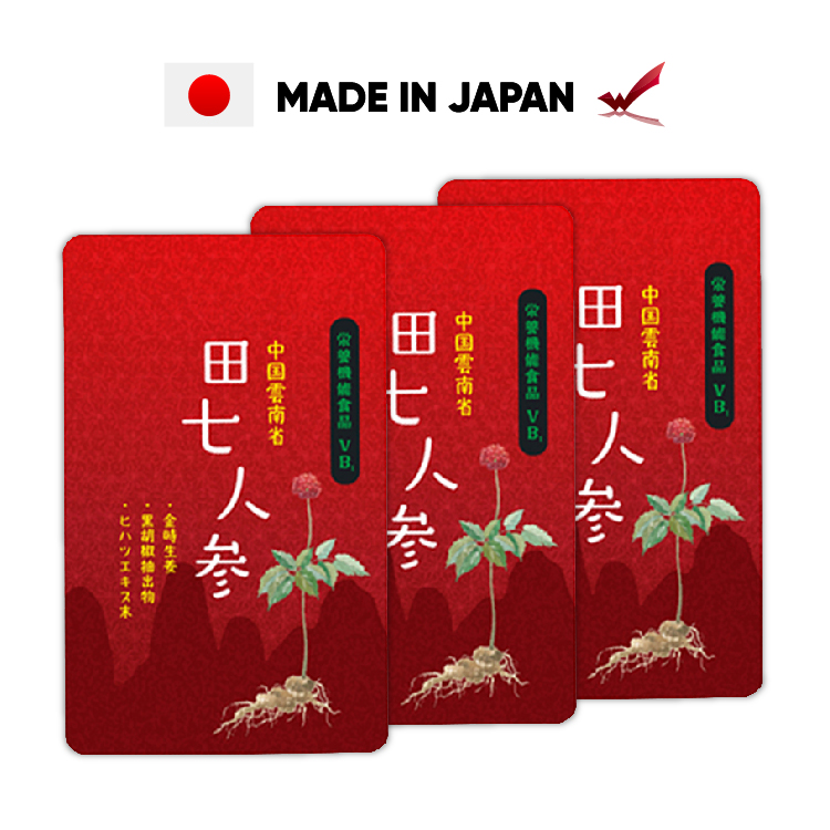 | 原材料 | 田七人参、ヒハツエキス金時しょうが、カプサイシン、黒胡椒抽出物、ビタミンB1、セルロース、ステアリン酸Ca、クエン酸 |