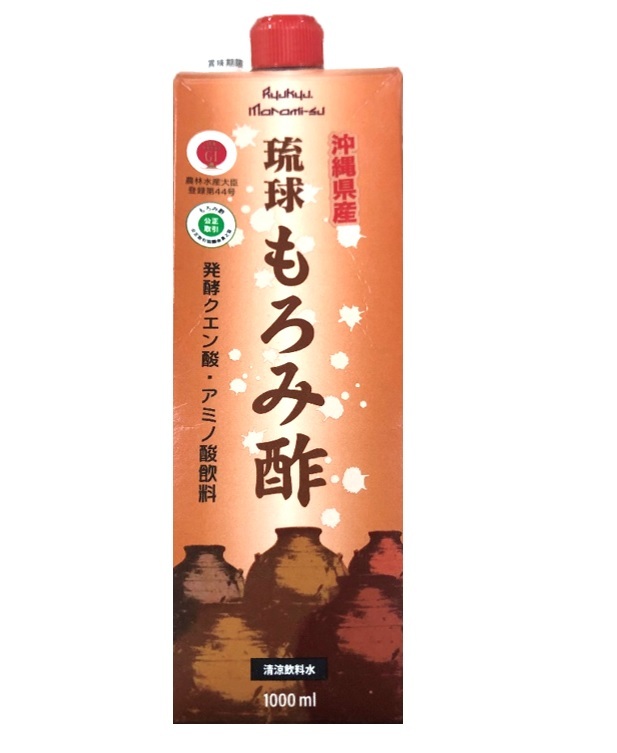 琉球もろみ酢は、沖縄特有のお酒?泡盛?の蒸留後のもろみから作られ、黒麹菌や酵母の発酵の過程で生成されるクエン酸をはじめ18種類のアミノ酸が含まれる飲み物です。