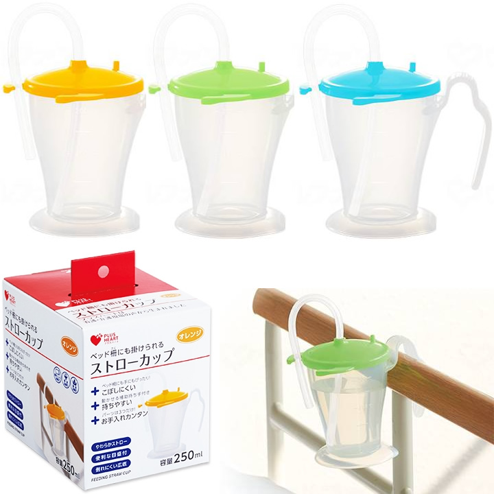 ●ベッド柵にも掛けられて、手にもぴったりはまる2段階持ち手のため、こぼしにくくなっています。
