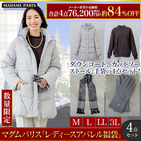 商品説明 | MADAME PARIS(マダム パリス)ブランドのアパレル福袋です。 軽くて暖かいダウンジャケット、肌触りがよく暖かいカットソー、リバーシブルでおしゃれに使えるストール、シンプルなデザインで使いやす手袋の4点セットです。 メーカー希望小売価格総額76,200円(税込)の4点セットを約84%OFFの大特価でお届けします。 |