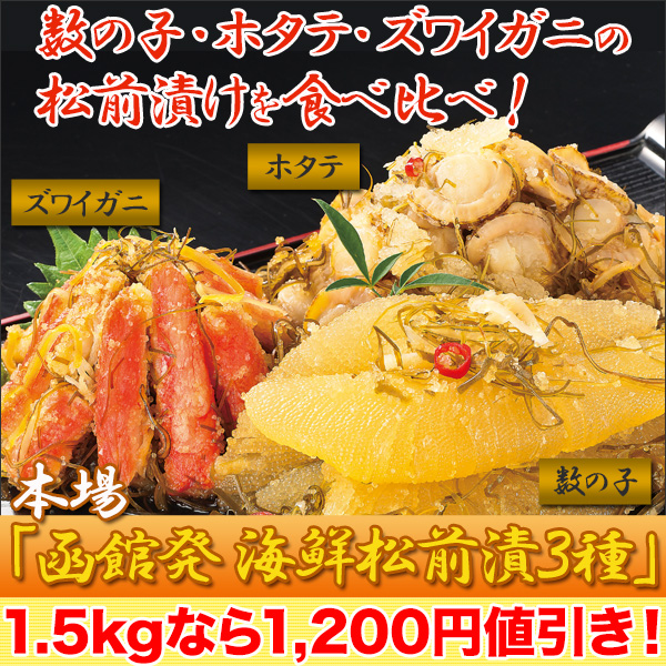 1.5kg:数の子松前漬500g、ズワイガニ入松前漬500g、ホタテ入松前漬500g