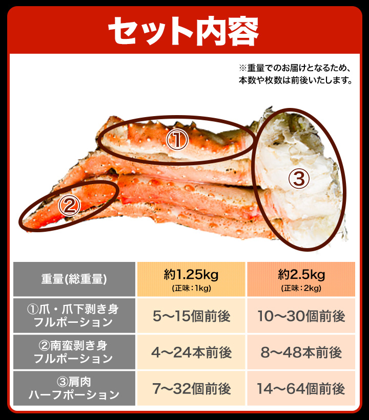 生タラバガニの南蛮・肩肉・爪下・爪の剥き身セットです。