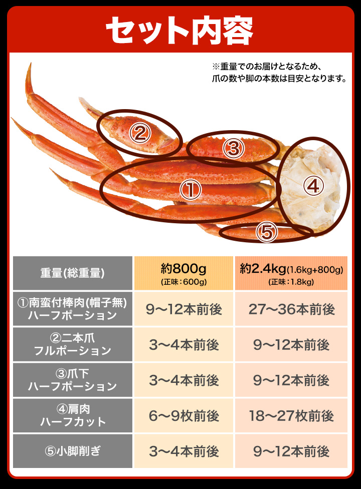 ※重量でのお届けとなる為、爪の数や脚の数は目安となります。