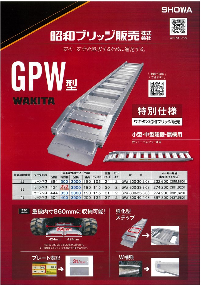 昭和ブリッジ アルインコ アルミブリッジ セーフベロタイプ GPW型 ユンボ積み込み バックホー 建設機械 大型トラック セルフ車 4トン車 重機運搬 プロ仕様 高強度 建機用アルミブリッジ おすすめ 特別仕様 GPW型ブリッジ セーフベロ アルミ板 歩み板 スロープ ラダー アルミ道板 WAKITA 大型トラクター 農機運搬 3メートル 幅広 パワクロ ゴムクローラー対応 農業用 業務用 高耐久 積載