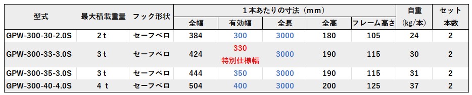 ● GPW-300-33-3.0S    全長300cm 有効幅33cm 最大積載重量3.0トン