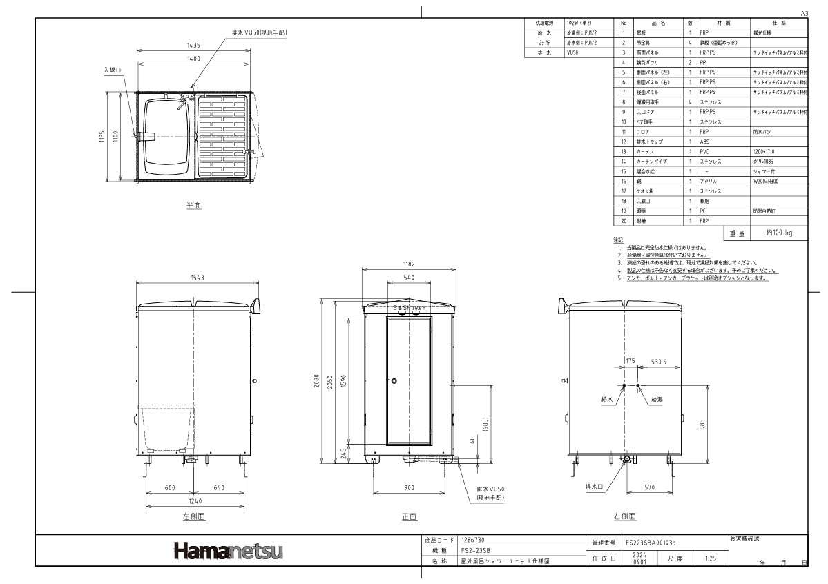 屋外風呂シャワーユニット FS2-23SB 浴槽付