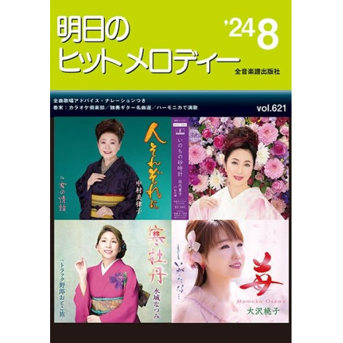 明日のヒットメロディー 2024-081 . あゝ…お母さん/2 . 苺/3 . 女ひとり雨/4 . 幸せの花よ咲け/5 . そぞろ雨/6 . なみだぐせ/7 . のんびり小唄/8 . 人それぞれに/9 . 遅咲きのHERO/10 . 青二才~わが友よ/11 . 雨の港駅/12 . 悲しいめぐり逢い/13 . いのちの砂時計/14 . 寒牡丹/15 . 朧月(おぼろづき)/16 . 道行き/17 . 京都 別れ雨/18 . 紅椿/19 . めおと浜唄/20 . カサブランカホテル/21 . 伝えるよ/22 . お酒がいいの冷やがいい/23 . 道南恋しや/24 . いごっそ海流/25 . おてんとさま/26 . おんなの花道/27 . 喜寿祝い/28 . 鳥羽の海女/