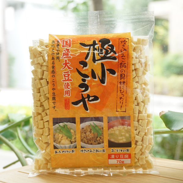 【取扱説明】国内産大豆100%使用の高野豆腐を1切約7mm×5mm×5mmの極小サイズにカットしました。非常に小さくカットしたことでみそ汁や炊き込みごはんの具として使用するほか、煮物以外の様々な料理にも幅広くご利用いただけます。