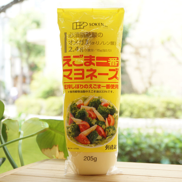 【原料名】食用植物油脂〔えごま油[えごま(中国)]、べに花油(アメリカ又はメキシコ)、なたね油(オーストラリア)〕(国内製造)、卵黄(中部地方、北陸地方)、醸造酢[りんご(チリ)、さとうきび(ブラジル、タイ他海外)]、砂糖[てんさい(北海道)]、食塩(オーストラリア、高知)、香辛料[マスタード(カナダ)]、(一部に卵・りんごを含む)