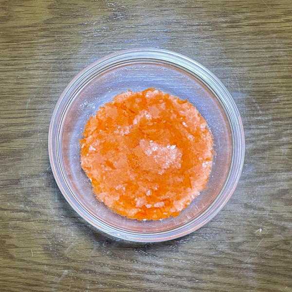 前回の目分量による失敗?を反省し、今回はホットケーキみっくす180g(約4枚分)に対して内容量40gのベビー・ポタージュは半分の20gをちゃんと計測して入れたところ、ボウルの中はとてもきれいなオレンジ色になりました(画像1→画像2)。