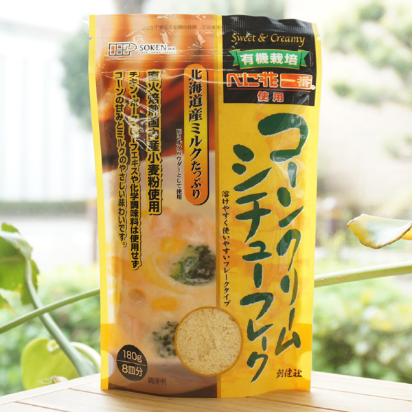 | もうそろそろだなと火を止め蓋のコックをひねり、圧を逃がすとブシューっと勢いよく蒸気が上がる。 フタを開け、創健社の有機栽培べに花一番使用 コーンクリームシチュー フレークを1袋全て放り込む。 |
