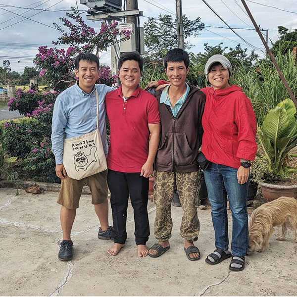 左から代表の塩川実さん、NICONICOYASAIベトナム側代表のティエンさん、クロムボン農場の農場長バオさん、塩川さんの妻のみどりさん