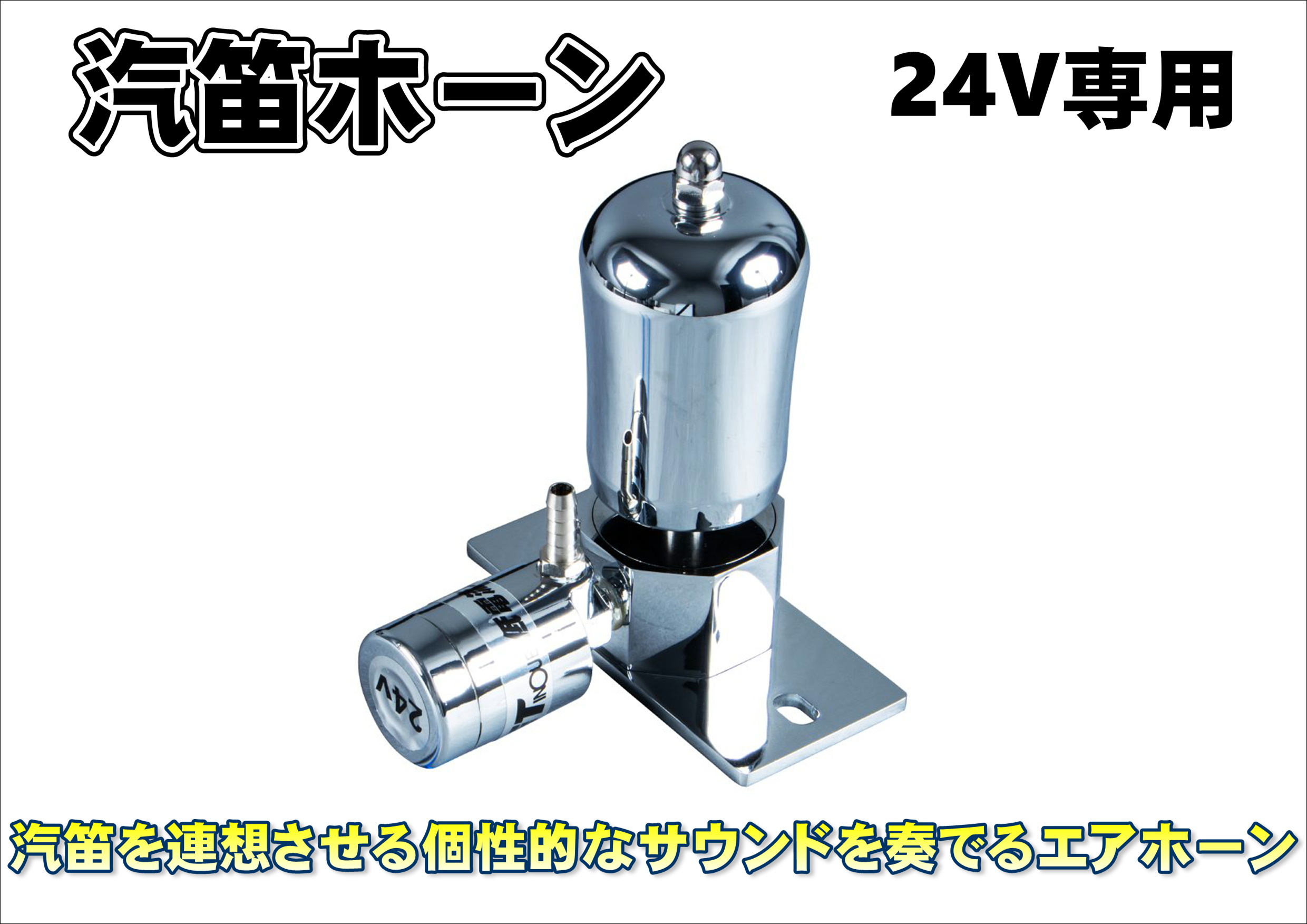 商品名 汽笛ホーン 24V製造メーカー ジェットイノウエ商品サイズ 134×60mm(取付けブラケット面)※バルブ含まず商品紹介 汽笛を連想させる個性的なサウンドを奏でるエアホーン。小型なボディに似合わず大音量。本体はALLステンレス製。24V車用。低電流仕様。■定格(マグネチックバルブ):DC24V 2.3A■付属品:取付け用ボルト&ナット、パッキン※本製品を下向きの取付け(吊り下げるような設置)はしないでください。水の侵入による故障の原因となります。※マグネチックバルブのホースニップルは、内径6.0mmφの高圧ゴムホース用となります。内径6.5mmφのウレタンホースでご利用の際は別途【505970】ホースニップルに付け替えてご利用ください。※空気圧は8kg/cm2(113psi)以内でご使用ください。9kg以上だと正常に作動しない場合があります。※エアー圧力が高い場合は正常な音がなりません。別途でエアーレギュレーターで調整が必要になる場合があります。※取付けは必ず充填式エアータンクをご使用ください。商品状態 新品注意事項 ※商品は在庫がない場合は納期がかかります。ご了承ください。
