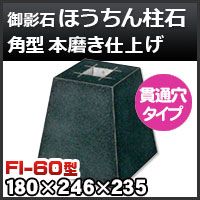 束石・塚石 ほうちん柱石 御影石角型(貫通穴タイプ)本磨き仕上げFI-60 天端6寸 ホゾ穴(mm)50×50×40mm 寸法(天×底×高)(mm)180×246×235mm