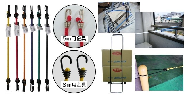 ○特長○両端に引っ掛け金具付きの丸ゴムロープ。 ○用途○着脱が必要な個所の固定具として。自転車、バイクの荷台への荷物の固定に。○仕様○○材質○○質量○○分類○梱包材/結束バンド/