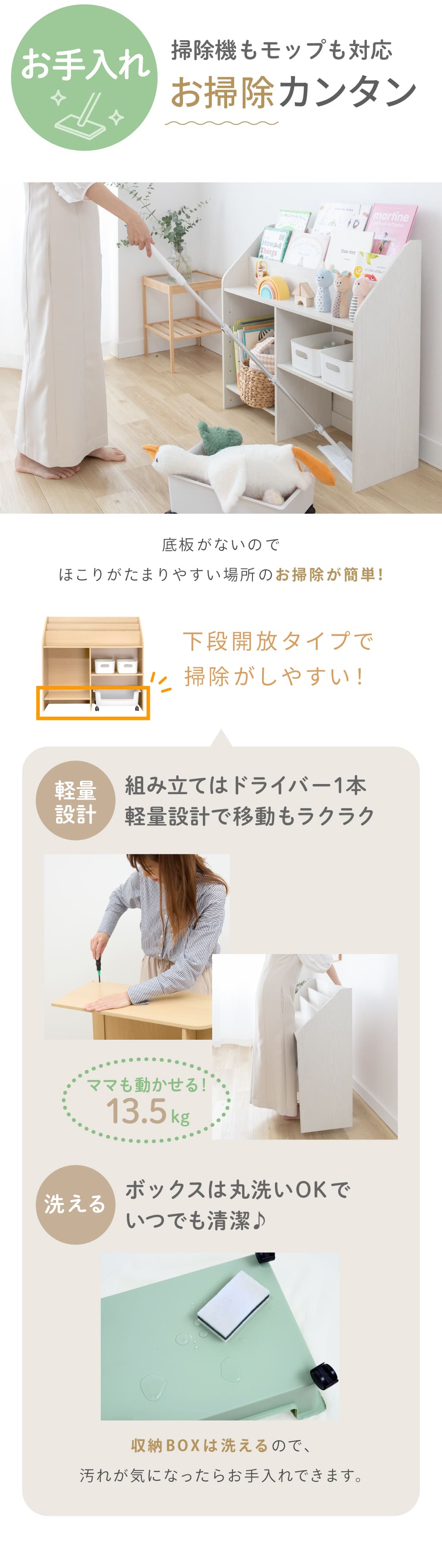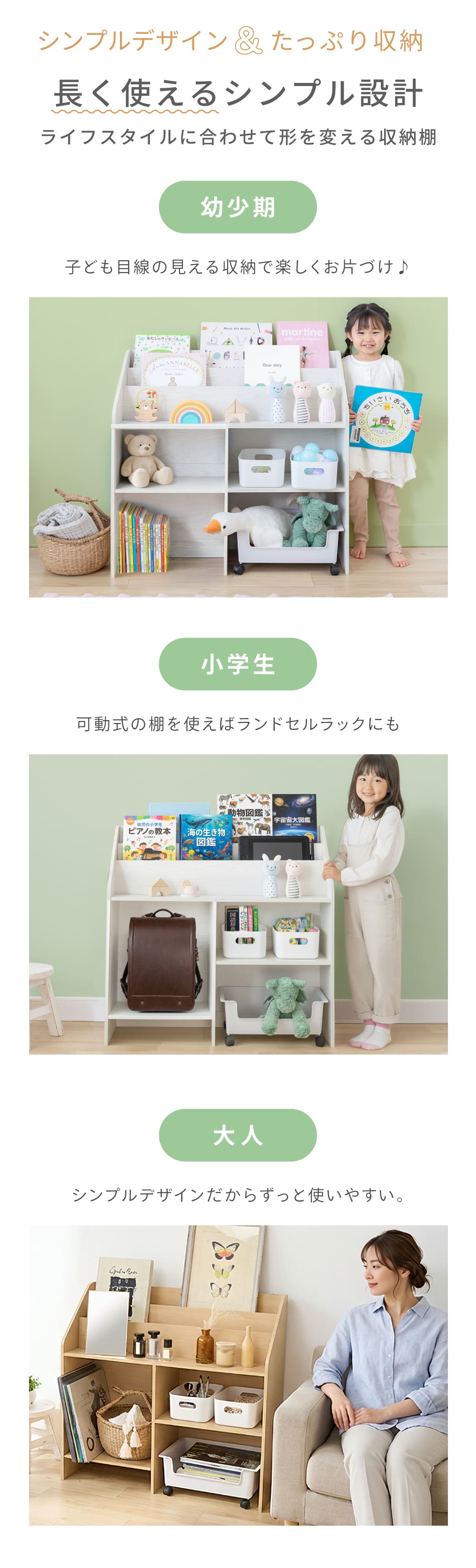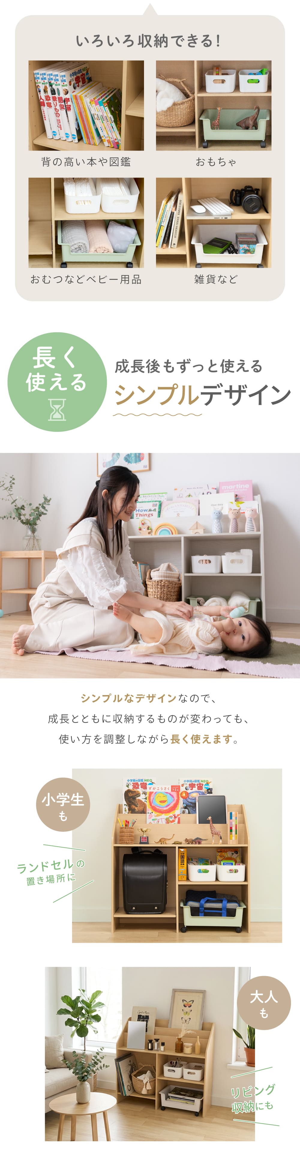 シンプルデザインで長く使いやすく、子どもの成長によりそってくれる絵本・おもちゃラックです。