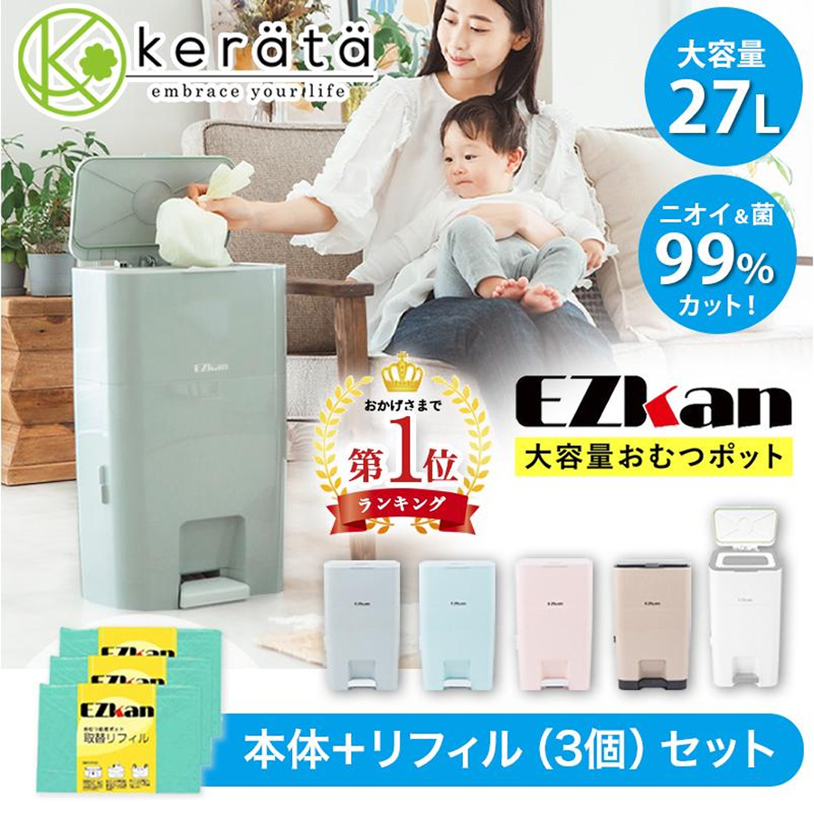 (ケラッタ) EZkan オムツ ゴミ箱 99% 抗菌 防臭 大容量 27L 二重フタ におわない袋 介護 ペット ネコ砂 ごみ箱 密閉 おむつポット ペール [本体+取替ロール]