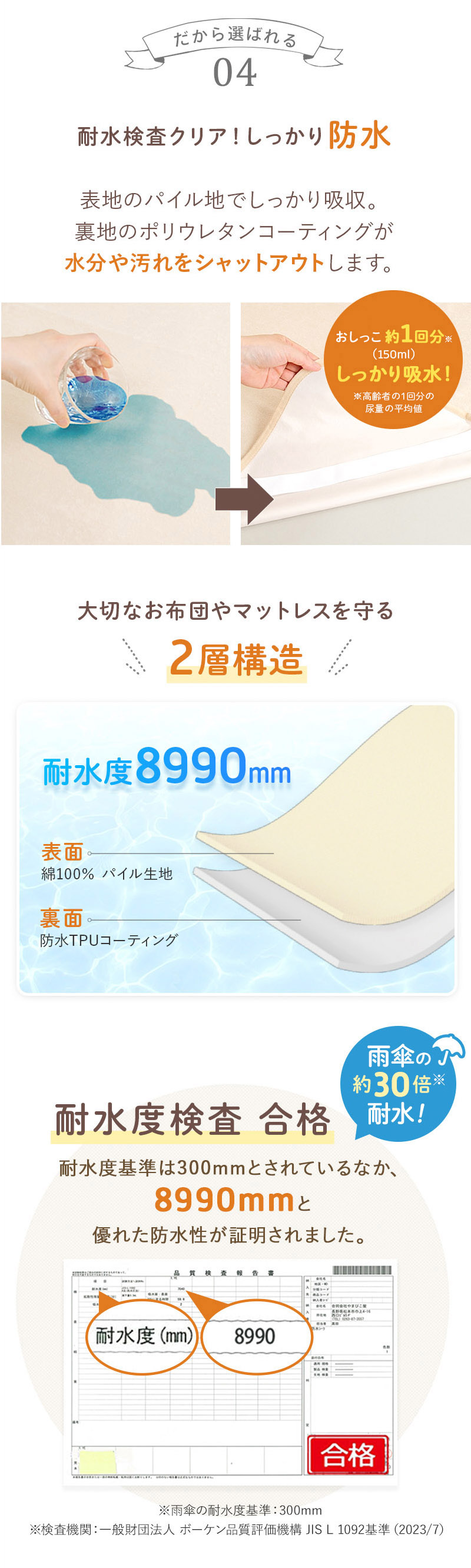| お手入れ方法 注意事項 | ・洗濯時は無蛍光中性洗剤・洗濯ネットを使用し、弱モード/短時間で洗濯脱水をしてください。 ・漂白剤・柔軟剤は使用しないでください。 ・防水加工をしていますので、洗濯機の脱水は短時間 (3分程度)で軽く水気がなくなる程度にしてください。長時間の脱水は洗濯機の故障 の原因になります。 ※お持ちの洗濯機(脱水機) の取扱説明書もご確認のうえ、指示に従ってください。 ・脱水時は洗濯機のそばを離れないでください。 ・物干し竿を使用の際は、防水面を外側にしてできるだけ広げて干してください。防水面が物干し竿に密着すると加工面がはがれる可能性があります。 ・乾燥機をご使用の際は60℃以下にして洗濯ネットに入れてください。コインランドリーやガス乾燥機は高温になりやすいため設定温度にご注意ください。 ・濃色の製品は単独洗いをしてください。 ・こちらは裏面に滑り止めがない仕様の製品です。 ・素材の特性上、パイル部分を強く引っ張ると糸抜けします。 ・防水シーツ端のテープ巻き縫製部分に水分がかかると縫い目から漏れるおそれがあります。 縫製部分に水分が流れないようご注意ください。 ・商品仕様は改良のため、生産と在庫状況により記載情報と若干仕様が異なる場合がございます。 ・閲覧時のモニター環境や光の当たり方などによって、写真と実際の商品の色合いが異なって見える場合がございます。 |