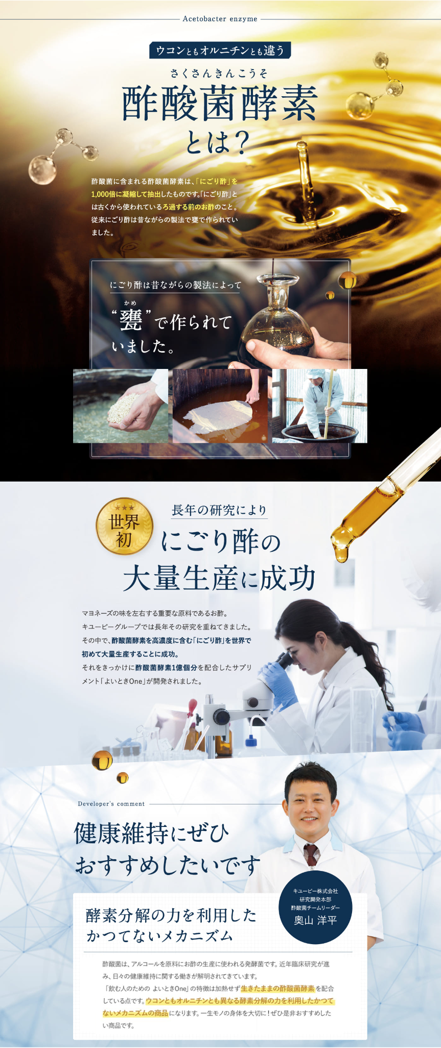 | 成分について | ◆酢酸菌酵素は、古くから伝わる「にごり酢」に存在します。◆キユーピーグループ 独自の醸造技術により、酢酸菌酵素を高濃度に含む「にごり酢」を世界で初めて大量 生産することに成功しました。 |
