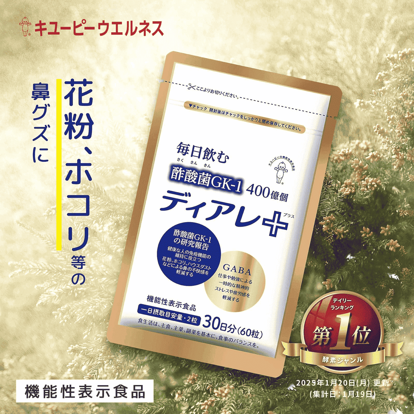 | 栄養成分表示 2粒(0.41g)当たり | エネルギー......1.4kcal たんぱく質...... 0.06g 脂 質 ......0.01 炭 水 化 物 ......0.33g 食塩相当量...... 0.0008g 機能性関与成分 酢酸菌GK-1(G.hansenii GK-1)400億個 GABA28mg |