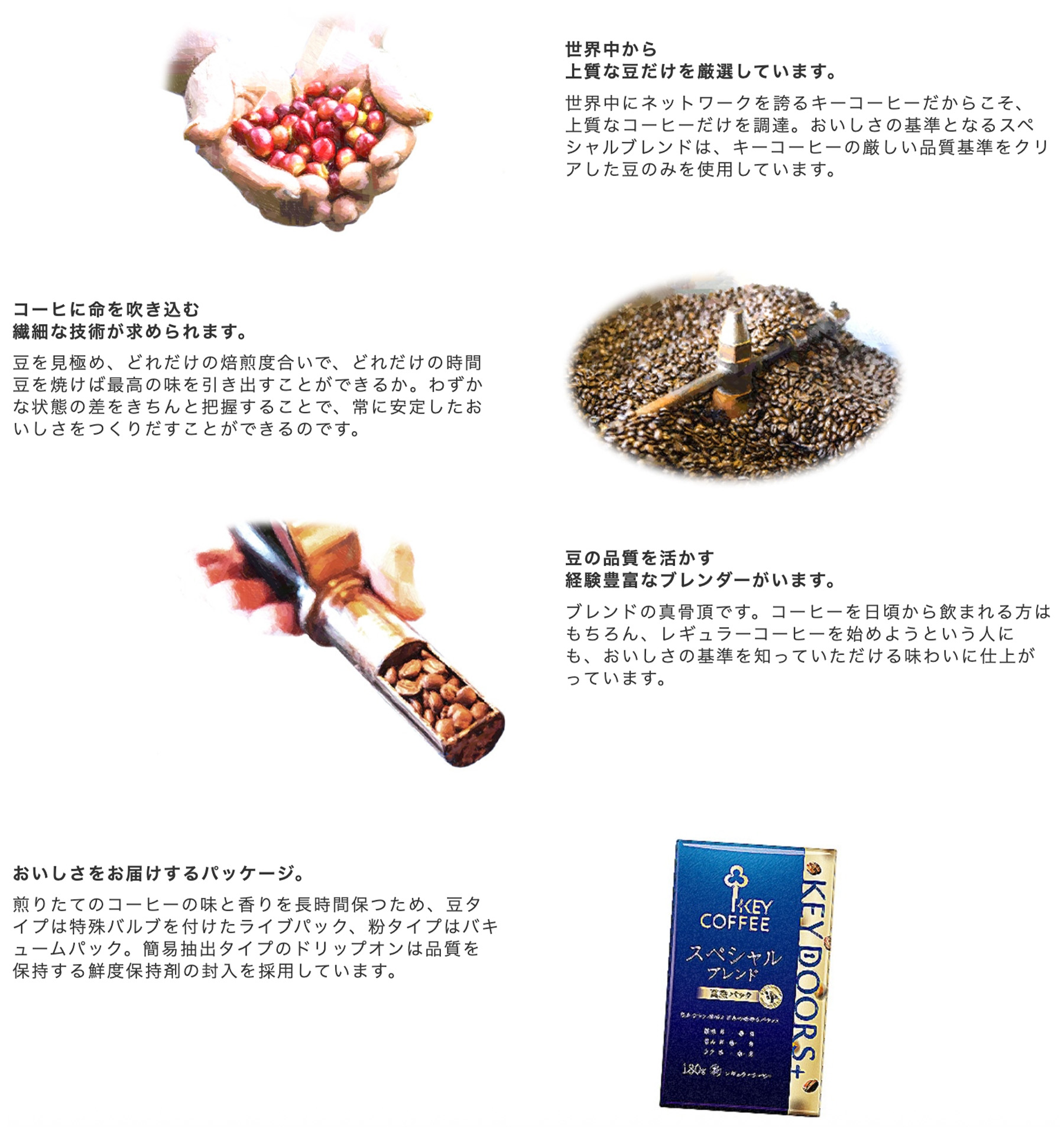 選び抜いた原料と経験豊富なブレンダーと焙煎士が醸し出す豊かな香りと味わいを提供する「KEY DOORS+」シリーズ。