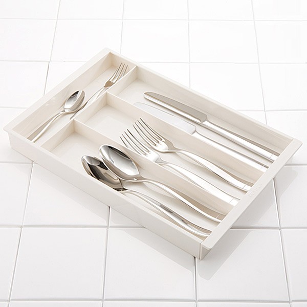 キッチン収納の引き出しに収まるように設計された国産の整理用トレー。箸置きや箸、ティースプーン、フォークなどを分けて収納できますので、探す手間が省けてとっても便利。勉強机の引き出しの鉛筆やペン、消しゴム、付箋など整理にも最適です。奥の部分が可動式となっており、最大約18cm伸びますので、引き出しのサイズにぴったり合わせて有効的に収納することが可能です。日本製。